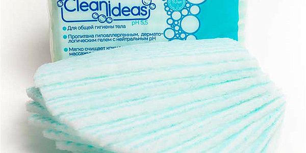 Пенообразующие одноразовые губки «Clean Ideas» изготовлены из нетканого материала (фиброволокно/полиэстер) и пропитаны дерматологическим и гипоаллергенным раствором (гелем) с нейтральным рН5,5.