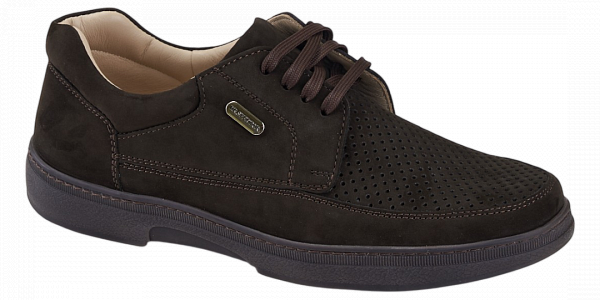 Верх выполнен из нубука, а поперечная перфорация по подъёму обеспечивает непрерывный влаго- и воздухообмен, что особенно важно при повышенном температурном режиме окружающей среды. Съёмная ортопедическая стелька с покрытием из натуральной кожи также имеет микроперфорацию, способствующую поддерживанию оптимального микроклимата внутри.